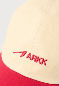 Μπεζ και κόκκινο καπέλο του μπέιζμπολ με κεντημένο κόκκινο λογότυπο "ARKK" μπροστά, με καμπυλωτό γείσο και κόκκινο κουμπί στην κορυφή, εμφανιζόμενο σε λευκό φόντο.