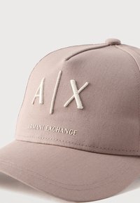 Ανοιχτό καφέ καπέλο baseball με καμπύλη γείσο, κεντημένο με το λογότυπο "A|X" και "Armani Exchange" στην μπροστινή πλευρά.