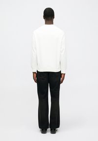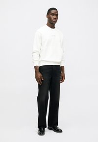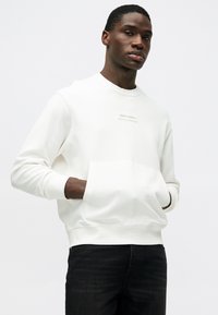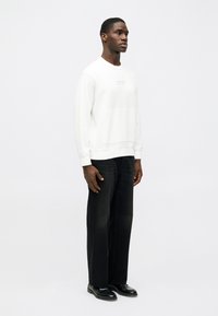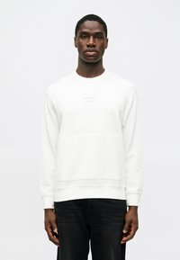 Άνδρας φορώντας ένα άσπρο φούτερ Armani Exchange και μαύρο παντελόνι, στέκεται μπροστά σε έναν λευκό τοίχο, κοιτώντας μπροστά.