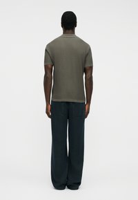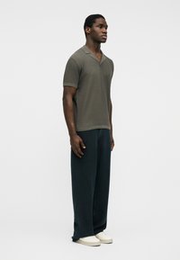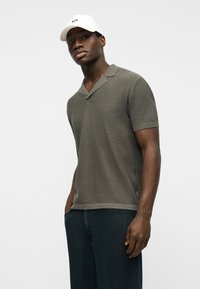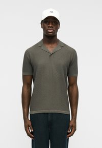 Άνδρας που φοράει λευκό καπέλο και πουλόβερ πόλο με κοντά μανίκια σε ελιά πράσινο χρώμα και σκούρο παντελόνι, στέκεται μπροστά σε απλό φωτεινό φόντο.