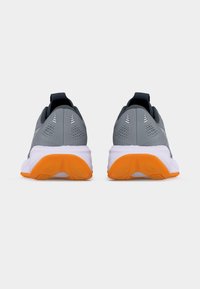 Γκρι και πορτοκαλί αθλητικό παπούτσι σε μέση ανύψωση πάνω από άσφαλτο με λευκές γραμμές, εμφανίζοντας τις λεπτομέρειες της μάρκας και την υφή της σόλας.