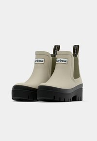 Μπεζ μποτάκια Chelsea από καουτσούκ με πράσινα ελαστικά πλαϊνά πάνελ και μαύρη σόλα με αυλακώσεις, με λογότυπο στο πλάι και θηλιά στο πίσω μέρος.