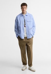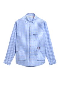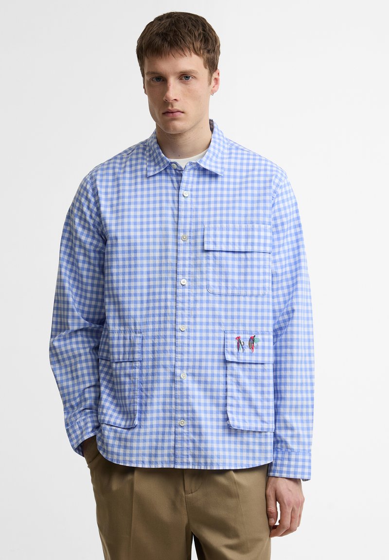 Νεαρός άνδρας που φοράει φανέλα με κουμπιά, σε ανοιχτό μπλε και λευκό καρό, με πολλές τσέπες και μικρές κεντημένες λεπτομέρειες.