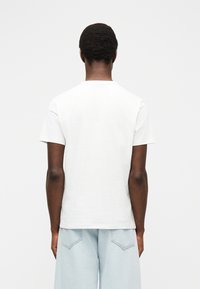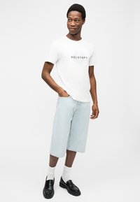 Νέος άνδρας που φοράει λευκό t-shirt με το λογότυπο Belstaff και ανοιχτόχρωμα τζιν, στέκεται μπροστά σε απλό, ανοιχτό φόντο.