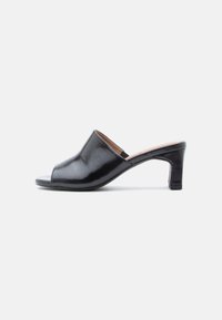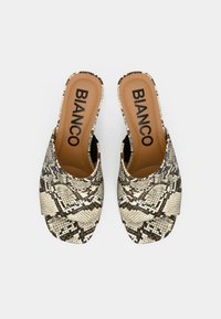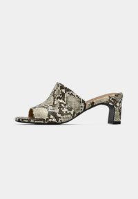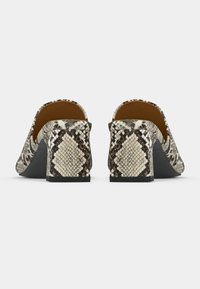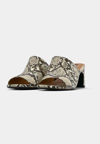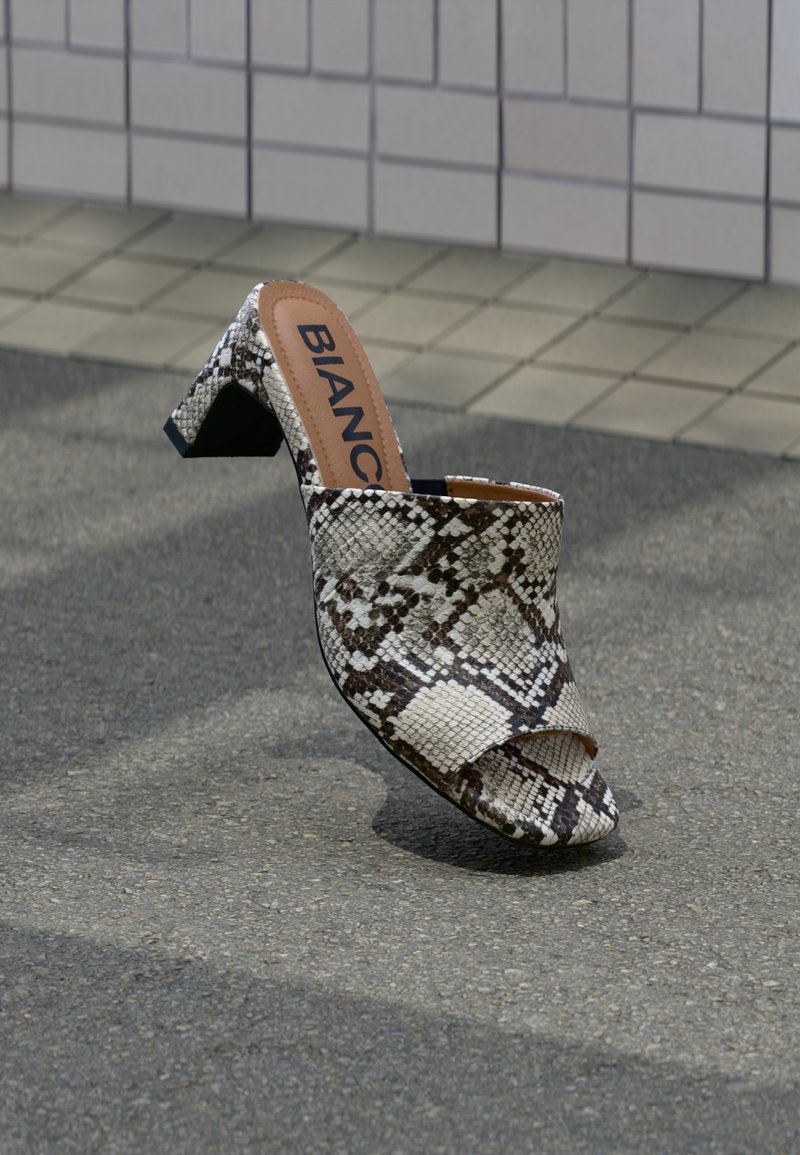 Ανοιχτό-toe mule με block τακούνι και μοτίβο φίδιου δέρματος, με ορατό όνομα μάρκας στην εσωτερική σόλα, τοποθετημένο σε υφή εξωτερικής επιφάνειας.