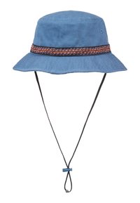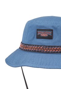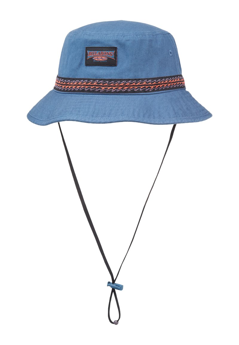 Μπλε καπέλο τύπου κουβά Billabong με φαρδύ γείσο, κεντημένη ταινία με κυματιστό μοτίβο, ρυθμιζόμενο μαύρο λουρί πηγουνιού με κούμπωμα.