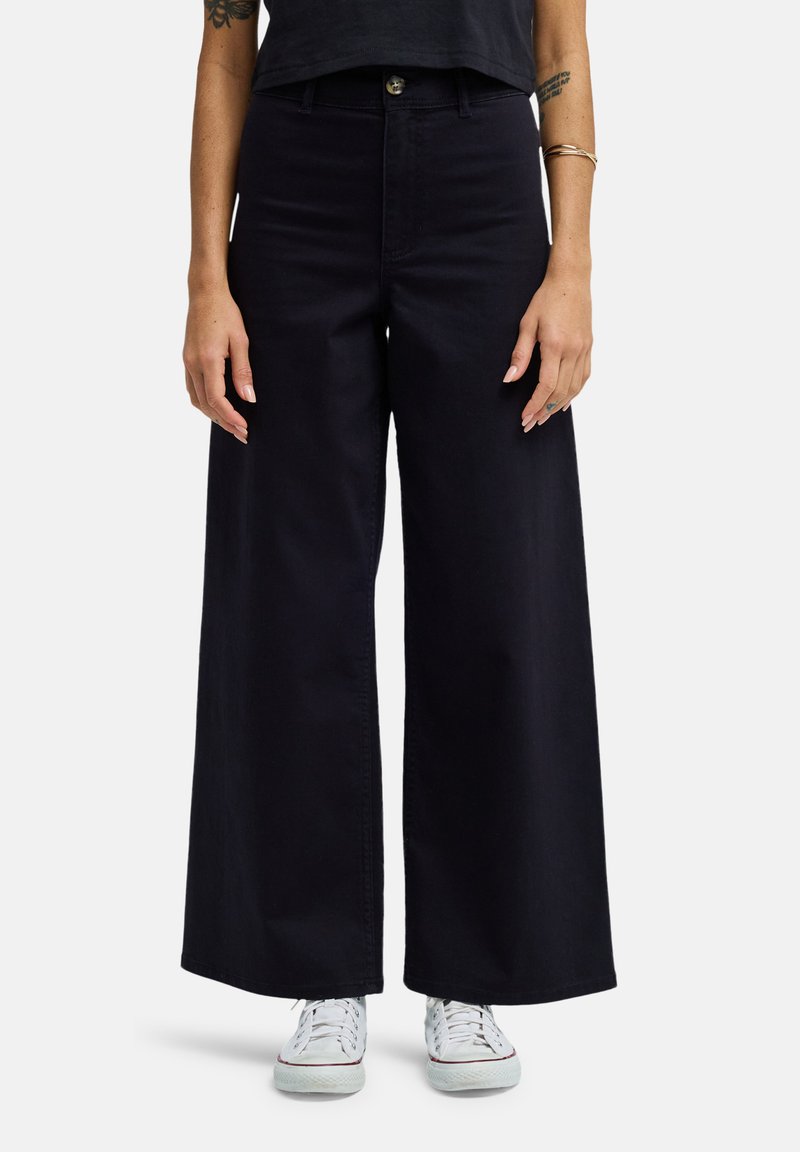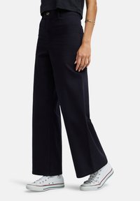 Σκούρο ναυτικό παντελόνι σε φάρδος με ψηλή μέση, μπροστινές τσέπες και κλείσιμο με κουμπί, κατασκευασμένο από μαλακό, υφασματοποιημένο υλικό.