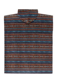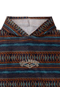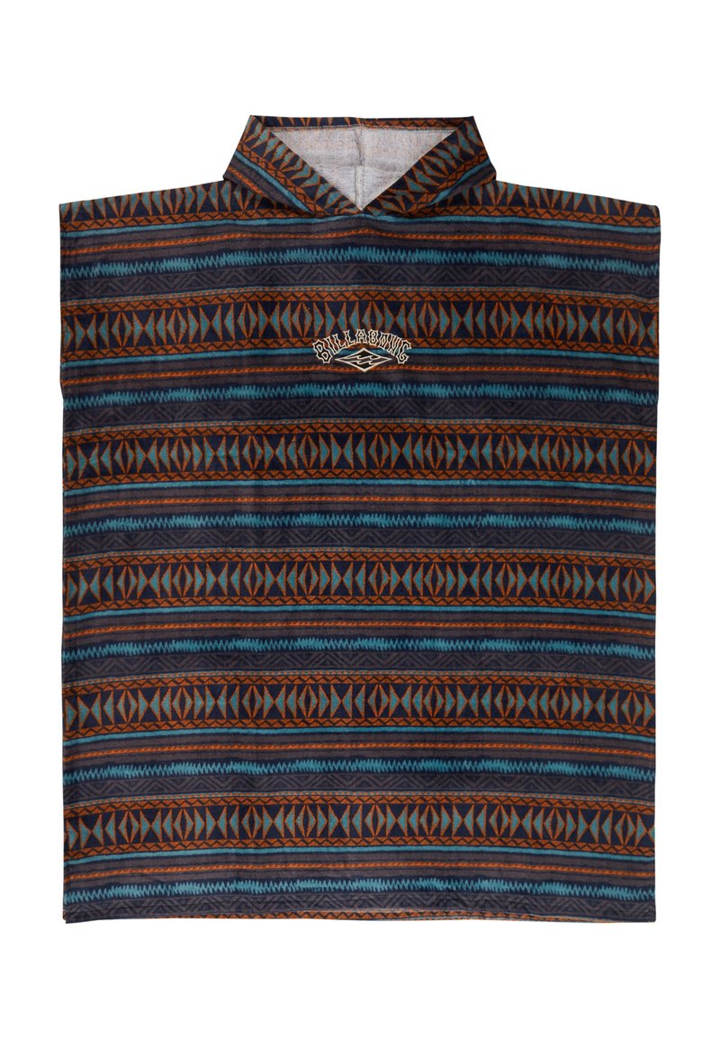 Πόντσο με κουκούλα και γεωμετρικό σχέδιο σε μπλε, καφέ και μαύρες ρίγες και το λογότυπο Billabong στο κέντρο κάτω από το γιακά.