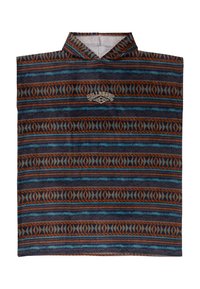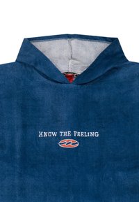 Μπλε πετσέτα-πόντσο με κουκούλα και κεντημένο το κείμενο "KNOW THE FEELING" και λογότυπο κύματος στο κέντρο μπροστά.