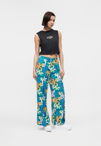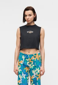 Άτομο με κοντά καστανά μαλλιά που φοράει μαύρο αμάνικο κοντό τοπ με λογότυπο ήλιου και το κείμενο "Billabong", και παντελόνια με έντονο φλοράλ σχέδιο.