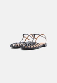 Μαύρο δερμάτινο σανδάλι με λουράκια, επίπεδη σόλα, ανοιχτή μύτη και σχέδιο T-λουριού. Διαθέτει σχέδιο σταυρωτής διασταύρωσης και ρυθμιζόμενο λουρί στον αστράγαλο.