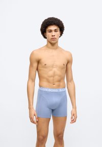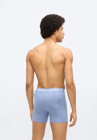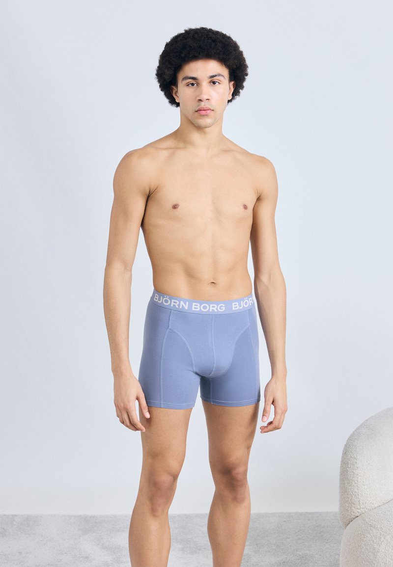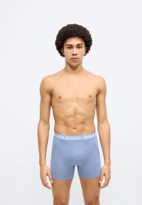 Μπλε ανδρικά εσώρουχα τύπου μποξέρ με μαλακή υφή και ελαστική ζώνη μέσης που φέρει το λογότυπο "BJÖRN BORG" σε λευκό χρώμα. Το μοντέλο στέκεται με τα χέρια στα πλευρά.