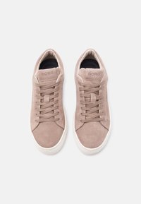 Χαμηλό καστόρινο αθλητικό παπούτσι σε απαλό ροζ χρώμα με κορδόνια στο ίδιο χρώμα και λευκή λαστιχένια σόλα, που δείχνει το πλαϊνό προφίλ και το όνομα της μάρκας στο πλάι.