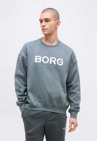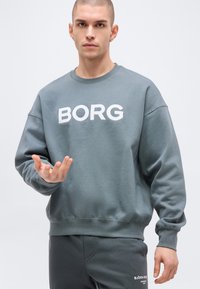 Νέος άνδρας με κοντά μαλλιά που φοράει γκρι φούτερ με το κείμενο "BORG", κοιτάζει προς τα πλάγια, τα χέρια στις τσέπες του παντελονιού.