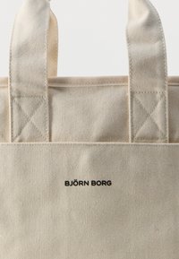 Μπεζ καμβά τσάντα χειρός με δύο λαβές, εμπρόσθια τσέπη, ρυθμιζόμενο λουρί ώμου και λογότυπο "BJÖRN BORG" στο κέντρο της τσέπης.