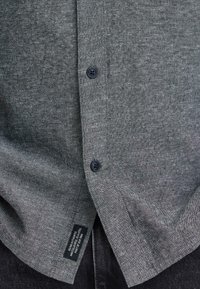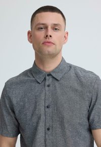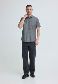 Άνδρας που φοράει κοντομάνικο γκρι πουκάμισο με κουμπιά και σκούρο τζιν, στέκεται με το ένα χέρι στην τσέπη σε απλό φόντο.