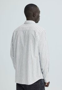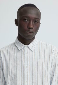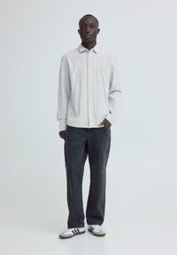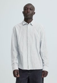 Άνδρας που φοράει λευκό πουκάμισο με μακριά μανίκια, κουμπωτό, με λεπτές κάθετες ρίγες και σκουρόχρωμο παντελόνι, μπροστά σε απλό φωτεινό φόντο.