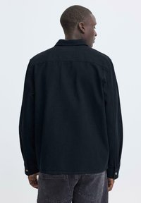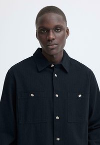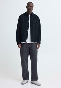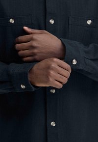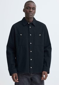Άνδρας που φοράει μαύρο πουκάμισο με κουμπιά και δύο τσέπες στο στήθος, καθώς και σκούρα τζιν, στέκεται μπροστά σε ένα απλό λευκό φόντο.