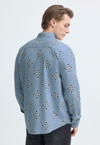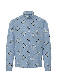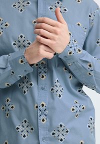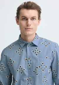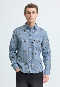 Νέος άνδρας με ανοιχτόχρωμο δέρμα και καστανά μαλλιά φοράει ένα ανοιχτό μπλε πουκάμισο με σκούρα λουλουδάτα σχέδια, στέκεται μπροστά από απλό φόντο.