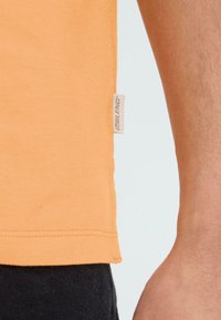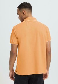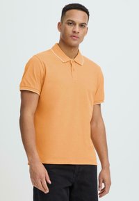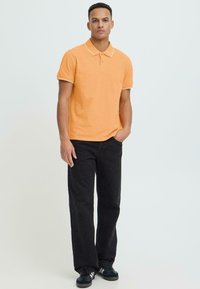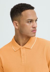 Άνδρας που φοράει πορτοκαλί πόλο μπλουζάκι με κοντά μανίκια και λευκή επένδυση, και μαύρο παντελόνι, στέκεται μπροστά σε ένα απλό φωτεινό φόντο.