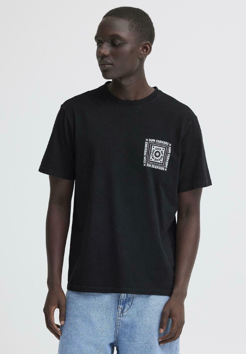 Νέος άνδρας που φοράει μαύρο μπλουζάκι με λευκό γραφικό "Sun Seekers" στην τσέπη στο στήθος, συνδυασμένο με ανοιχτό μπλε τζιν παντελόνι.