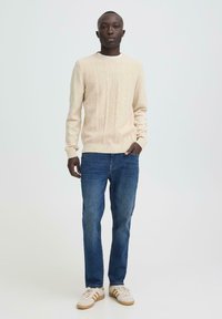 Άνδρας που φοράει σκούρο μπλε τζιν κανονικής εφαρμογής και λευκά αθλητικά παπούτσια με μπεζ ρίγες, στέκεται μπροστά σε ένα απλό φωτεινό φόντο.
