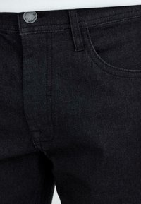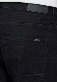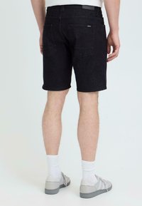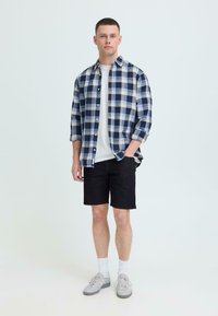 Άνδρας που φοράει μαύρα τζιν σορτς, άσπρες κάλτσες μέχρι τον αστράγαλο και ανοιχτό γκρι αθλητικά παπούτσια, στέκεται μπροστά σε απλό λευκό φόντο.