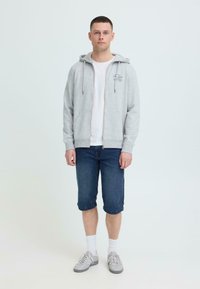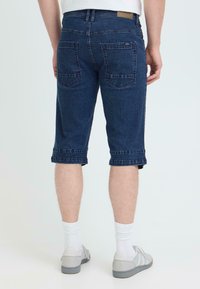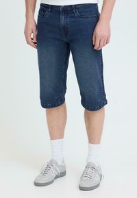 Ανδρας που φοράει σκουρό μπλε τζιν σορτς μέχρι το γόνατο, λευκές κάλτσες και ανοιχτογρίζα αθλητικά παπούτσια, στέκεται πάνω σε απλό φωτεινό φόντο.