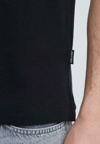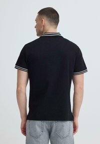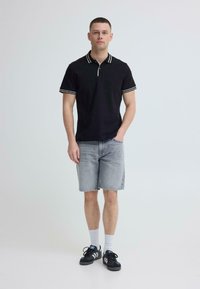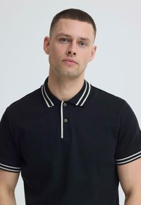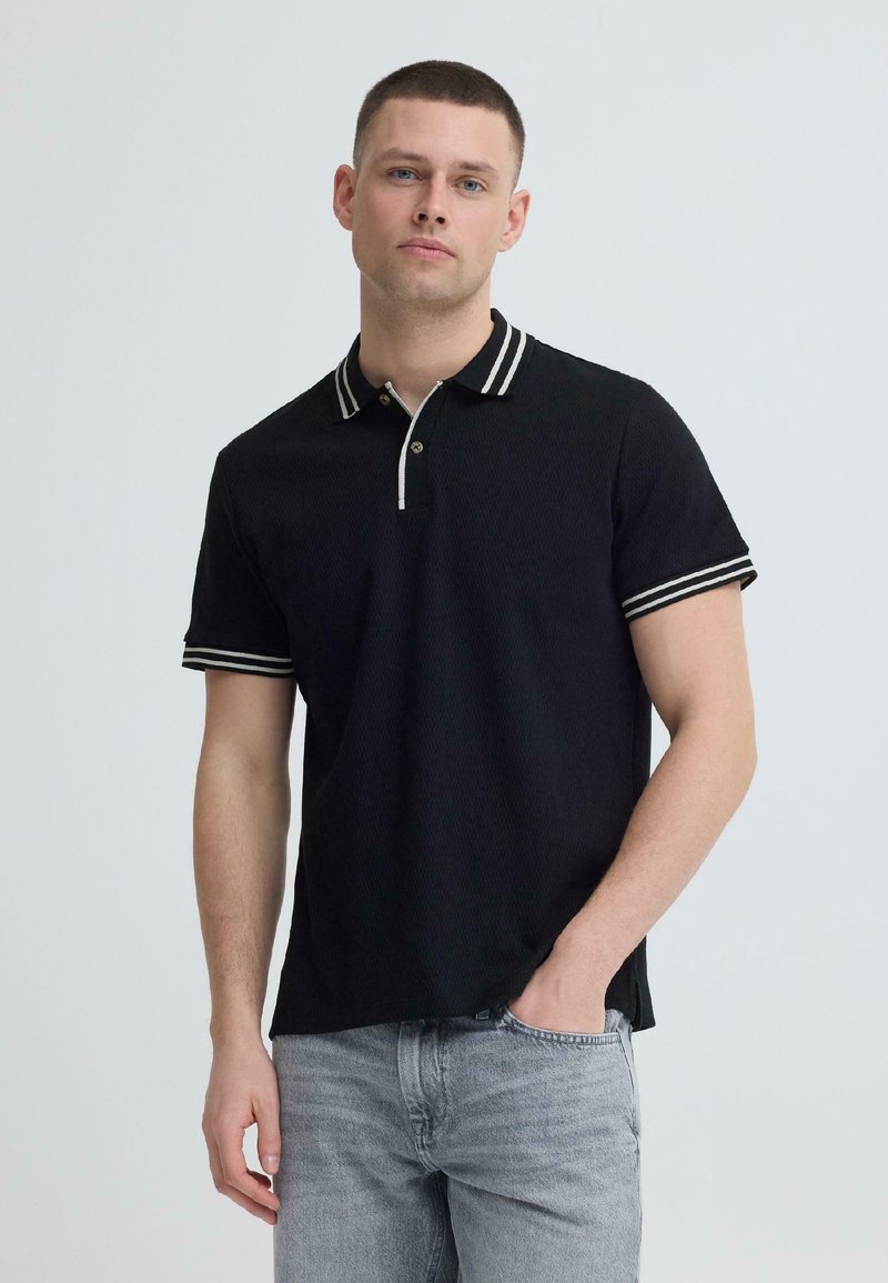 Άνδρας με κοντά μαλλιά που φοράει μαύρο πόλο με άσπρες ρίγες στο γιακά και τα μανίκια, ανοιχτό μπλε τζιν, με το ένα χέρι στην τσέπη.