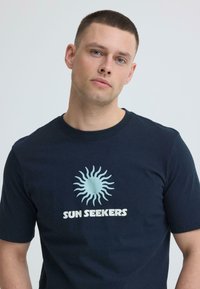 Άνδρας που φοράει μπλε μπλουζάκι "SUN SEEKERS" με γαλάζιο γραφικό ήλιο, στέκεται με το ένα χέρι στην τσέπη του γκρι τζιν, κοιτάζοντας δεξιά.