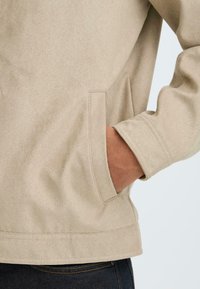 Άνδρας με μπεζ μπουφάν με φερμουάρ και γιακά όρθιο, και σκούρο τζιν, στέκεται μπροστά σε απλό φωτεινό φόντο.