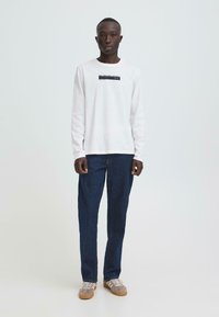 Άτομο που φοράει σκούρα μπλε τζιν παντελόνια με ίσια γραμμή, λευκό πουκάμισο με μακριά μανίκια και μπεζ αθλητικά παπούτσια με λευκές ρίγες, στέκεται σε απλό φόντο.