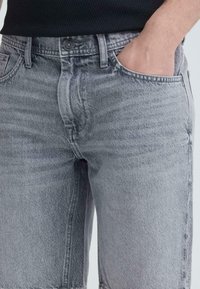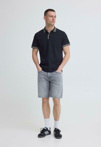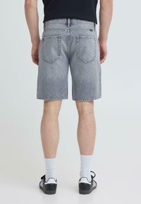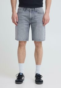 Άνδρας που φοράει ανοιχτό γκρι τζιν σορτς, μαύρα αθλητικά παπούτσια με λευκές ρίγες και λευκές κάλτσες, στέκεται μπροστά σε απλό φόντο.
