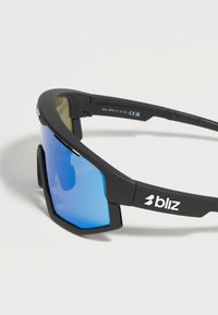 Μαύρα αθλητικά γυαλιά ηλίου με έναν μοναδικό γωνιακό μπλε καθρεφτισμένο φακό και σήμανση "bliz" στο πλαϊνό μέρος και στο πάνω μέρος του σκελετού.