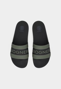 Μαύρο και ελιάς πέδιλο-σλάιντ με το λογότυπο "BOGNER", τοποθετημένο σε μπεζ χαλί κοντά σε στρογγυλό καφέ τραπέζι.