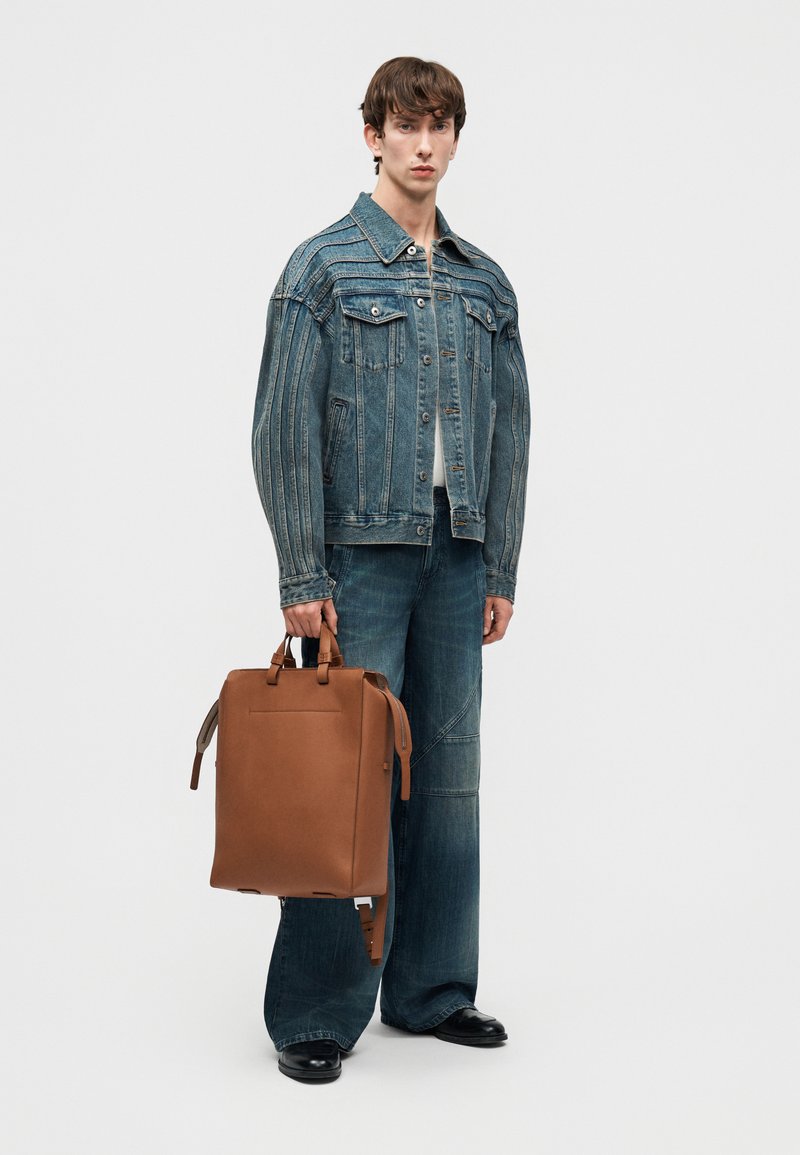 Νεαρός άνδρας που φοράει μπλε τζιν μπουφάν και τζιν παντελόνι, κρατώντας ένα μεγάλο καφέ δερμάτινο σακίδιο από τις λαβές του.