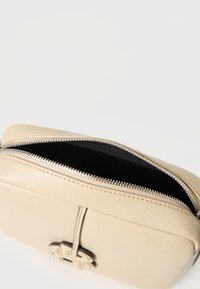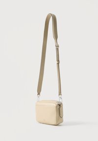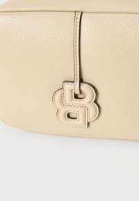 Μπεζ ορθογώνια δερμάτινη τσάντα χιαστί με αποσπώμενο λουρί και διακοσμητικό κεντημένο λογότυπο στο εμπρόσθιο μέρος.