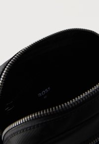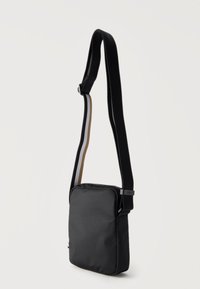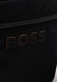 Μαύρη τσάντα crossbody με μπροστινή τσέπη με φερμουάρ, φαρδιά λουρίδα με καφέ περιθώρια και λογότυπο "BOSS" σε μαύρα και καφέ γράμματα.