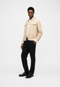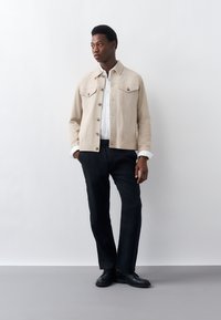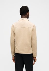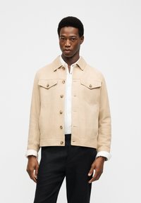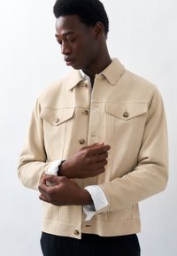 Νεαρός άνδρας που ρυθμίζει τα μανίκια ενός μπεζ σακάκι με κουμπιά και δύο τσέπες στο στήθος, σε απλούν λευκό φόντο