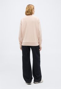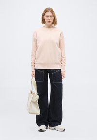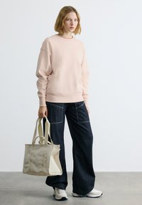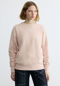 Νεαρή γυναίκα με κοντά μαλλιά που φοράει ένα ανοιχτό ροζ φούτερ BOSS και σκούρο τζιν, στέκεται μπροστά σε ένα απλό λευκό φόντο.