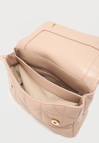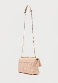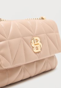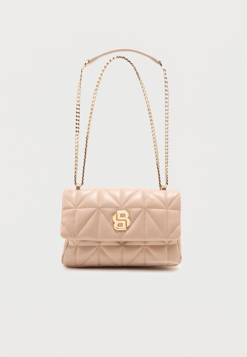 Μπεζ καπιτονέ δερμάτινη τσάντα ώμου με λουρί από χρυσή αλυσίδα και χρυσό κούμπωμα με διπλό λογότυπο «B» στο μπροστινό καπάκι.