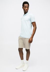 Άτομο που φοράει μπεζ σορτς με κορδόνι και μαύρη ρίγα, ανοιχτό μπλε πουκάμισο, λευκές κάλτσες και λευκά αθλητικά παπούτσια, στέκεται σε γκρι δάπεδο.