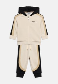 Μπλε ναυτικό φούτερ με κουκούλα και λευκές και ανοιχτό μπλε ρίγες στα μανίκια, σετ με ταιριαστά παντελόνια φόρμας που διαθέτουν διακοσμητική πλευρική λωρίδα στο πόδι.