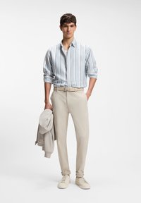 Νεαρός άνδρας που φοράει ανοιχτό μπλε ριγέ πουκάμισο, μπεζ παντελόνι και αθλητικά παπούτσια, κρατώντας ένα μπεζ σακάκι στο ένα χέρι, με λευκό φόντο.