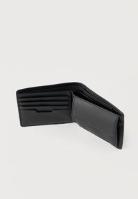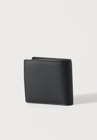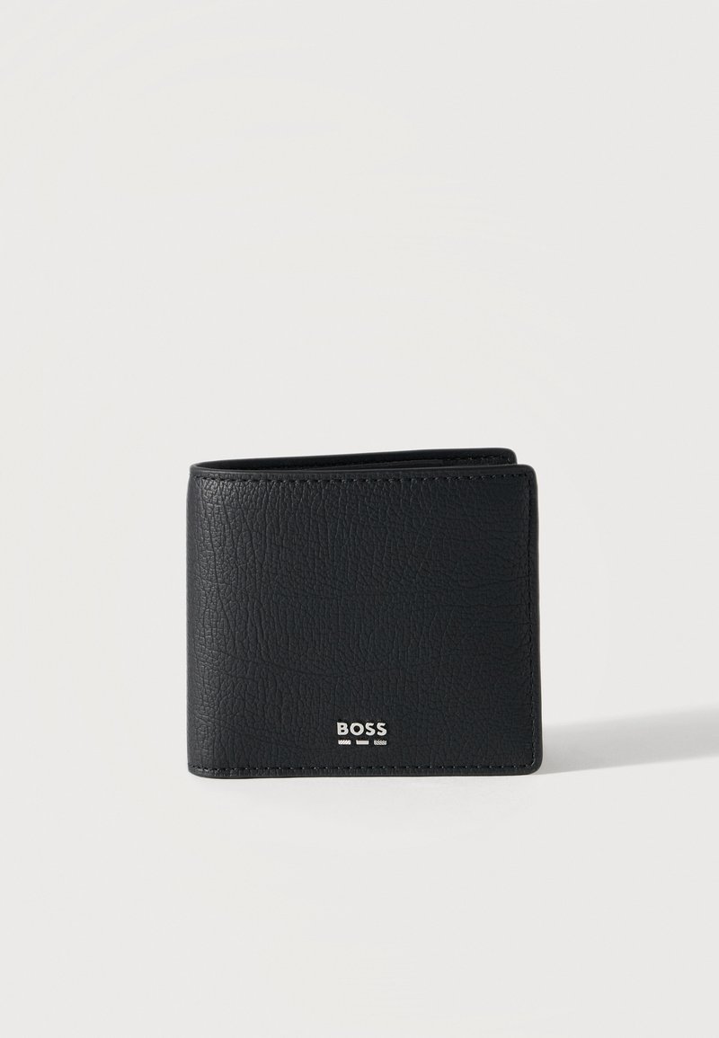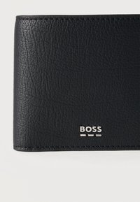 Διπλό πορτοφόλι από μαύρο δερμάτινο υλικό με ανάγλυφο λογότυπο "BOSS" σε λευκό στο κέντρο της πρόσοψης, σε λευκό φόντο.