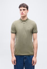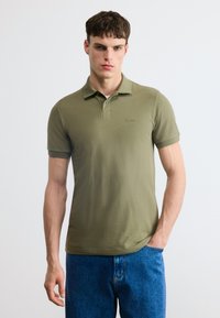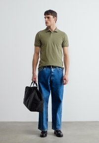 Νεαρός που φοράει ελιάς πράσινο πόλο πουκάμισο με κοντά μανίκια και μπλε τζιν, στέκεται με το ένα χέρι στην τσέπη μπροστά σε απλό φόντο.