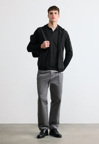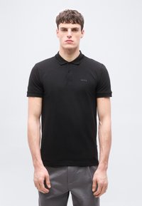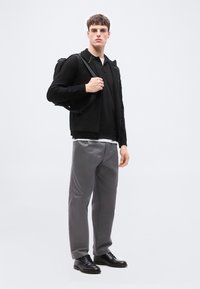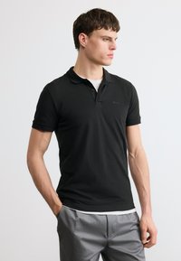 Άνδρας με μαύρο κοντομάνικο πόλο πουκάμισο και γκρι παντελόνι, στέκεται με το ένα χέρι στην τσέπη, κοιτάζοντας προς τα πλάγια σε απλό φόντο.