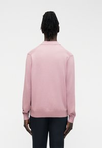 Νέος άνδρας με ροδακινί μακρυμάνικο πόλο πουκάμισο και σκούρο παντελόνι, στέκεται μπροστά σε απλό ανοιχτό γκρι φόντο.