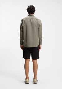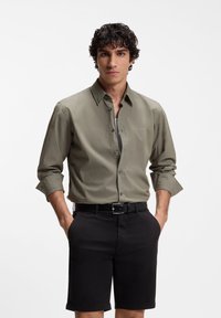 Άνδρας με σγουρά σκούρα μαλλιά, φορώντας μια ελιά πουκάμισο με κουμπιά και ρεβέρ στα μανίκια και μαύρα σορτς με ζώνη, με τα χέρια στις τσέπες.
