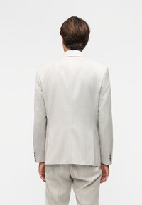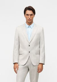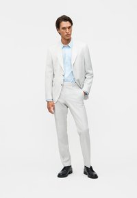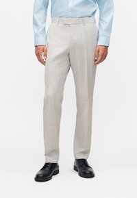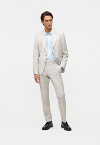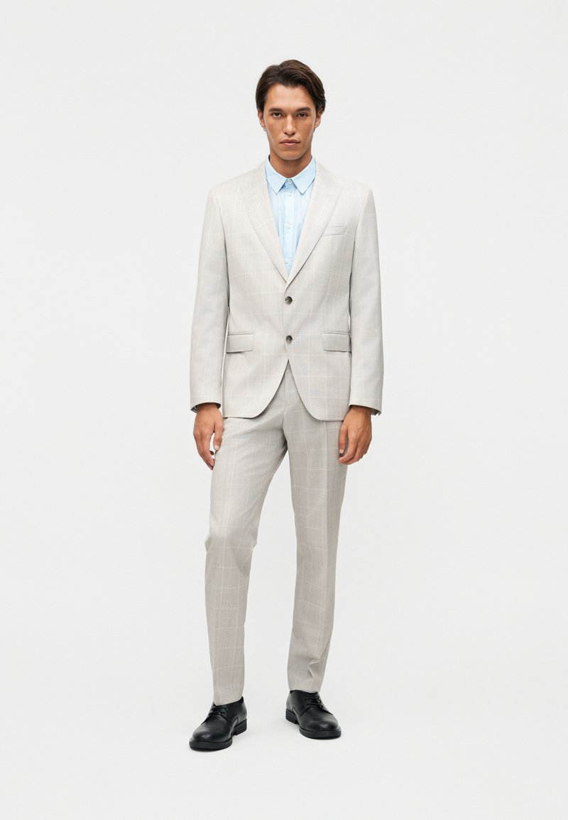 Άνδρας που στέκεται, φορώντας ανοιχτό γκρι κοστούμι με σχέδιο καρό, ανοιχτό μπλε πουκάμισο και μαύρα επίσημα παπούτσια, μπροστά σε ένα απλό λευκό φόντο.